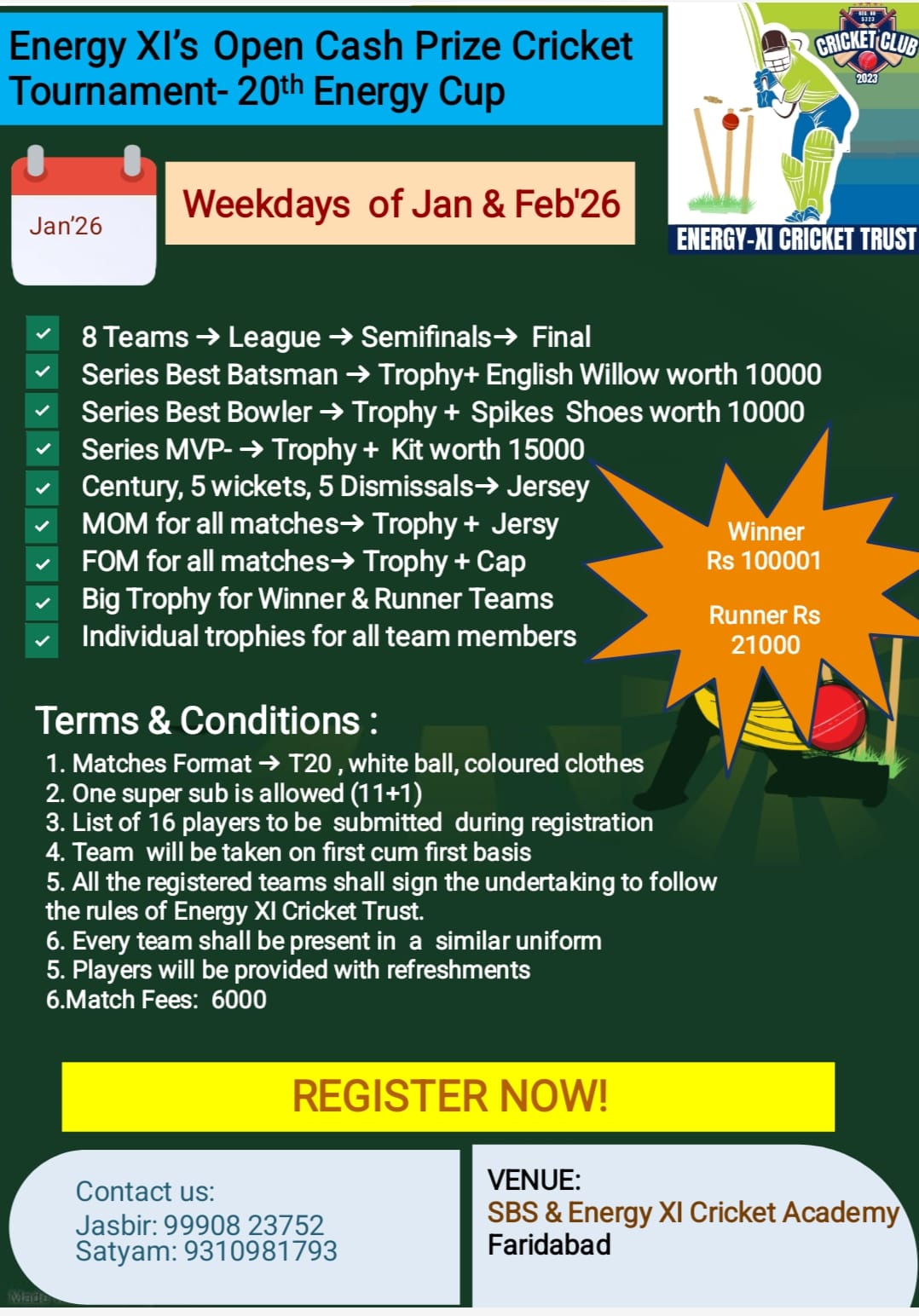 #EnergyXI #CricketTournament #T20Cricket #CashPrize #RegisterNow #20thEnergyCup #Faridabad